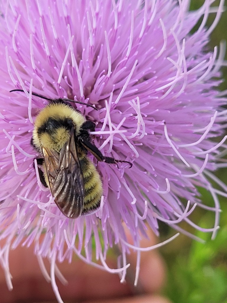 On early mornings in September, I often see bees in the large pink blossoms of field thistle, holding on with their legs, or even their mandibles. With the cool temperatures slowing, the bees waking and the soft light that is so good for photography, fall is a wonderful time to grab your camera and your nose, and head out to smell the fall blooming flowers and see who might be slumbering within them.