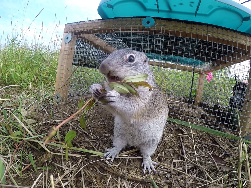 As part of the reintroduction project at Kankakee Sands, Purdue Fort Wayne researchers selected 25 Franklin’s ground squirrels in South Dakota for collection and translocation under a bi-state permit. The ground squirrels passed their veterinarian inspection, and then spent 21-days in quarantine to ensure that they were free from disease. Just before releasing the squirrels into their outdoor acclimatizing enclosures on the prairie, it was noted that several of the females had given birth to litters of young!